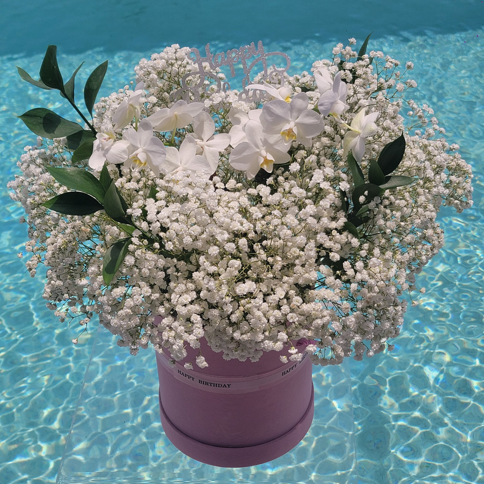 The Orchid & Baby’s Breath Birthday Box is a dreamy arrangement designed to impress. Featuring a lush cloud of delicate white baby’s breath, accented with elegant white orchids and fresh greenery, this bouquet radiates purity and sophistication. Presented in a chic lavender hatbox with a Happy Birthday detail, it’s the perfect floral gift to make birthdays unforgettable.